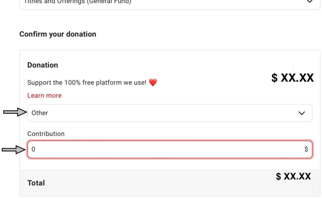 Zeffy is a fundraising page for Non-profits, every penny you send goes directly to the church, with no fees! You DO have the option to donate to their cause, however you’re not required. It automatically adds a suggested contribution after you set your donation amount. Click OTHER to set the CONTRIBUTION field to whatever amount you please or just put “0” or leave it blank.
