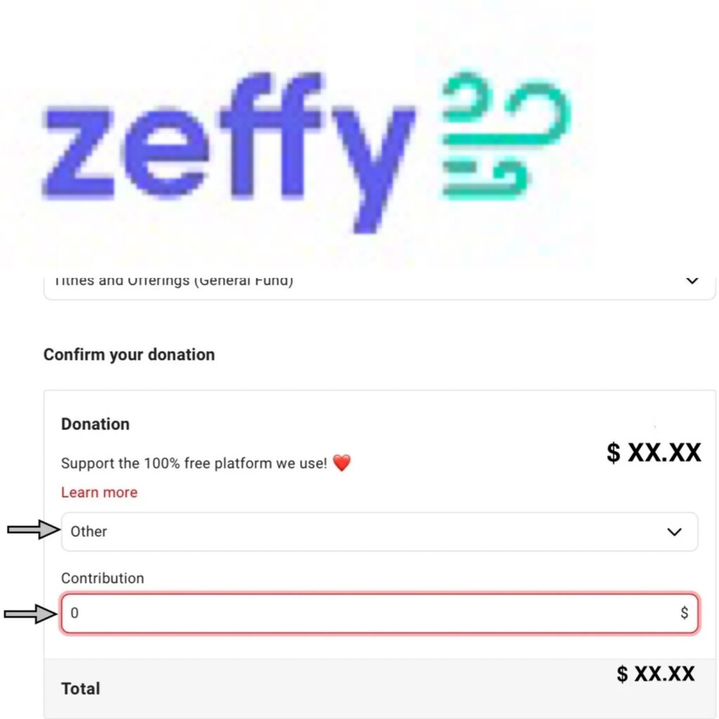 Zeffy is a fundraising page for Non-profits, every penny you send goes directly to the church, with no fees! You DO have the option to donate to their cause (automatically adds a suggested contribution after you set your donation amount) but you’re not required. Click OTHER to set the CONTRIBUTION field to whatever amount you please or just put “0” or leave it blank.